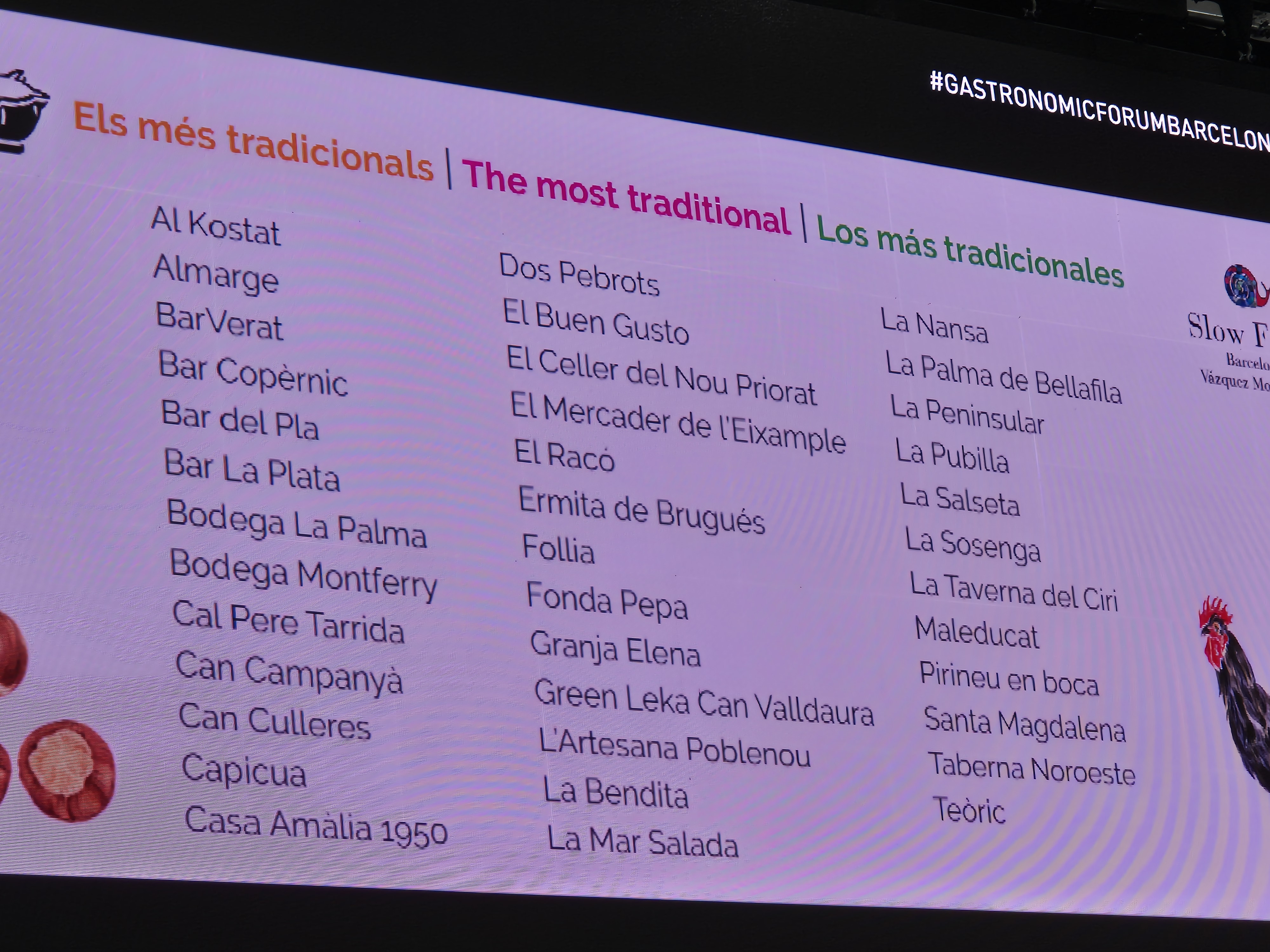 En mi intervención, desde el público, (no pretendía ser una pregunta), dije que la alta cocina catalana (en el sentido amplio de la palabra de cocina que se hace en Cataluña) lleva 30 años más que visible con esos tres restaurantes que fueron primeros en la 50Best, como lo recordó Marc), y con Cala Montjoi como epicentro gastro mundial durante 20 años, pero también gracias a la gran cantidad de restaurantes estrellados que tenemos o la floreciente bistronomía barcelonesa y gironina. Solo queda pendiente hacer conocer a estas cantidades ingentes de turistas que nos visitan (se ha llegado a una saturación cuantitativa ya insuperable), primero el territorio y su cocina con sus rasgos culinarios propios (acotar el ceviche, el taco y el sushi a quienes han optado, con toda legitimidad, por estos categorías gastronómicas. Si no, todo se va a confundir y parecer igual, aquí y en la Cochinchina).
